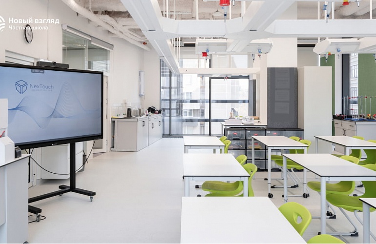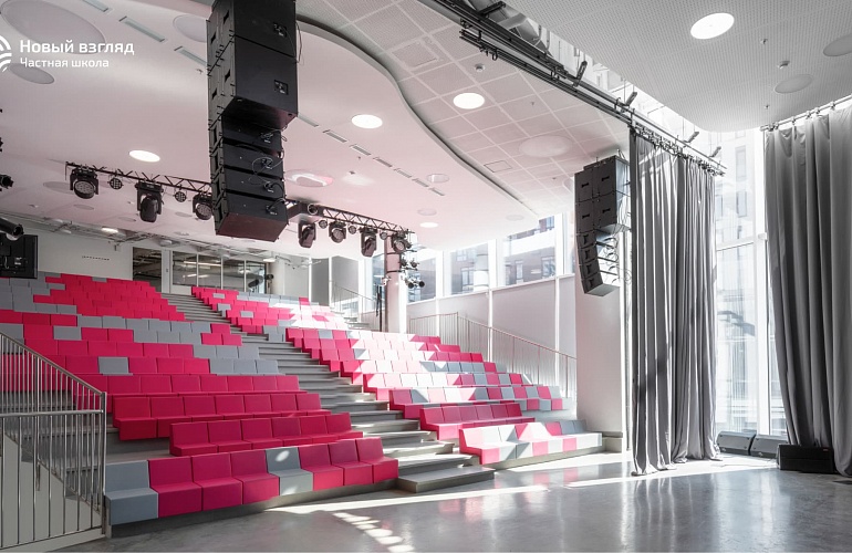 «Новый взгляд» — современная школа в Хамовниках, где пространство продумано до мелочей. Здесь есть пространства для обучения и творчества: лаборатории, кулинариум, фаблаб и многое другое. В школе есть зоны для уединения и отдыха, создающие баланс между активной учебной деятельностью и спокойным времяпровождением. Продумана и инфраструктура для взрослых: например, есть отдельная тьюторская, также есть и учительская, организованная по принципу open space. В школе продуманы архитектурные и интерьерные решения: например, актовый зал — сердце школы — открыт, но при использовании не создает помех для других.