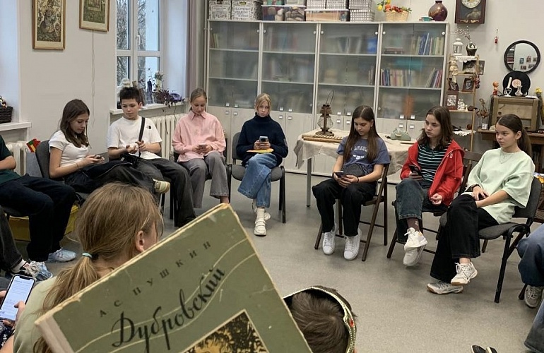 Занятие проводила кандидат искусствоведения, доцент Александра Борисовна Никитина, ведущий научный сотрудник лаборатории социокультурных образовательных практик. И мой педагог! Темы встречи обсудили заранее: «Дубровский», «Лексика», «Пространство». Мы действительно читаем «Дубровского», изучаем лексику и наконец, встречаемся с новым пространством: «Как только мы зашли туда, почувствовали тепло и уют бабушкиной комнаты» (Соня И.). И первое задание как раз было связано с тем, чтобы найти в этой теплой «бабушкиной комнате» свое уютное местечко. Большинству ребят приглянулась старинная кровать: с подзором, пуховыми подушками, с вышитыми накидками. «Мне понравился угол, в котором стояла кровать, как у бабушки в деревне», — потом поделится Маргарита С., а Максим Ж. вспомнит «огромный шкаф с книгами и красивый круглый стол». Но все же, по мнению Андрея У., «самое интересное — множество творческих заданий».