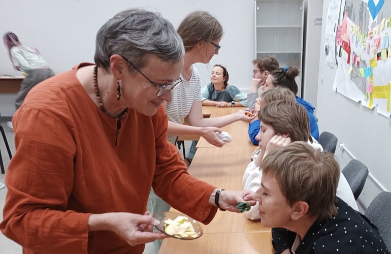 На прошедшей встрече в ткань рассказа Бунина «Антоновские яблоки» ведущие решили входить через запахи осени. Игра, когда участники с закрытыми глазами вдыхали разнообразные ароматы, оказалась очень вдохновляющей. Вот один из откликов: «Благодарю организаторов за прекрасную работу, а участников — за прекрасное сотворчество. Идея с ароматами великолепна. Она отнесла меня по ощущениям в состояние младенца, который попал в дикую природу и пытался познать мир на зубок и на нюх».