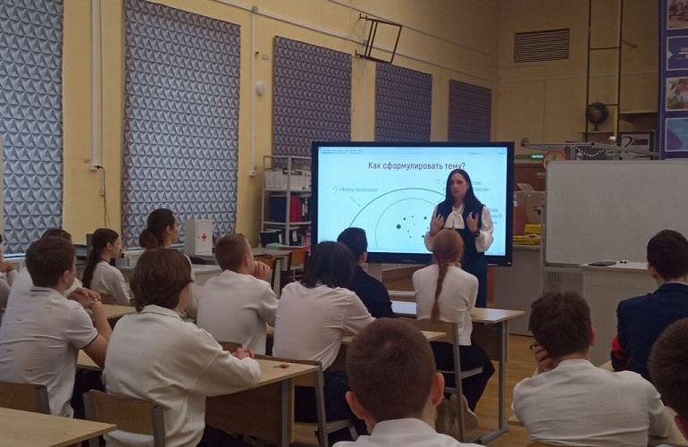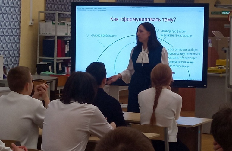 Татьяна Анатольевна обсудила со школьниками функции темы и показала важность правильной формулировки. Школьники согласились: из множества работ в первую очередь хочется прочитать ту, у которой самый интересный заголовок.